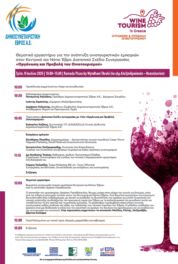 Στο πλαίσιο του Διατοπικού Σχεδίου Συνεργασίας "Οργάνωση και Προβολή του Οινοτουρισμού", η Δημοσυνεταιριστική Έβρος Α.Α.Ε. Ο.Τ.Α. σε συνεργασία με δήμους, επαγγελματίες και ακαδημαϊκούς, διοργανώνει θεματικά εργαστήρια, εισηγήσεις, γευσιγνωσίες και περιηγήσεις, στις 9–11 Ιουλίου 2025, με στόχο την ενίσχυση της σύνδεσης του τοπικού οίνου με τον τουρισμό και την τοπική οικονομία.