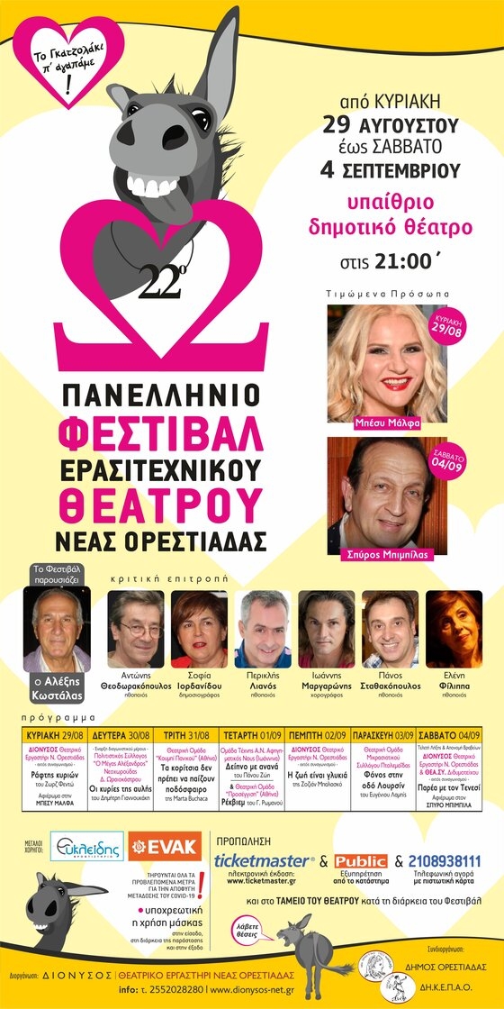 Σημειώνεται ότι το Φεστιβάλ διοργανώνεται με την πλήρη τήρηση των υγειονομικών πρωτοκόλλων που επιβάλλει η Πολιτεία, για την αποφυγή διάδοσης του covid19.