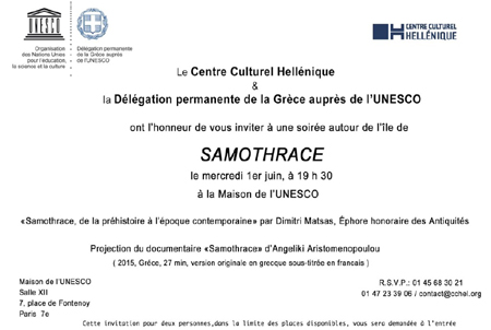 Το Ελληνικό Κέντρο Πολιτισμού στο Παρίσι διοργανώνει εκδήλωση με θέμα ΣΑΜΟΘΡΑΚΗ την Τετάρτη 1 Ιουνίου 2016 στις 19.30 στα γραφεία της UNESCO στο Παρίσι. (Salle XII 7, Place de Fontenoy Paris 7e).