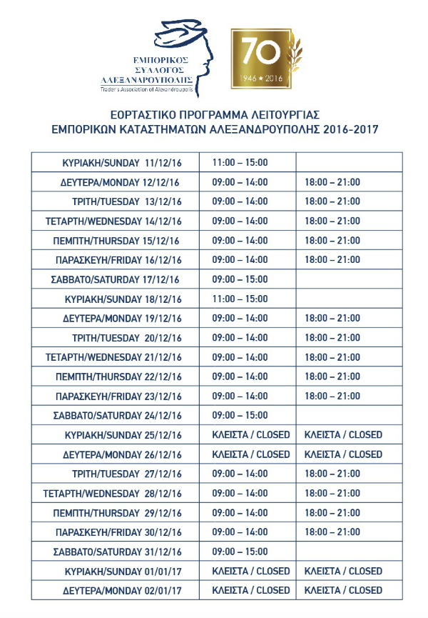 Την Κυριακή 11 Δεκεμβρίου 2016 ξεκινά η εφαρμογή του χριστουγεννιάτικου εορταστικού ωραρίου των εμπορικών καταστημάτων της Αλεξανδρούπολης και διαμορφώνεται ως εξής: