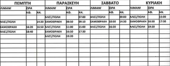 Σας ενημερώνουμε ότι λόγω δυσμενών καιρικών συνθηκών το δρομολόγιο του πλοίου της εταιρείας μας Ε/Γ-Ο/Γ ΑΔΑΜΑΝΤΙΟΣ ΚΟΡΑΗΣ δεν θα εκτελεστεί σήμερα από Αλεξανδρούπολη προς Σαμοθράκη και αύριο 6/02/20 από Σαμοθράκη προς Αλεξανδρούπολη 07:00 και εφόσον το επιτρέψουν οι καιρικές συνθήκες θα εκτελέσει τα δρομολόγια του από 06/02/2020-09/02/2020 σύμφωνα με την παρακάτω εικόνα: