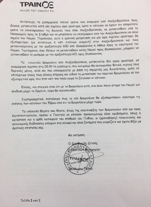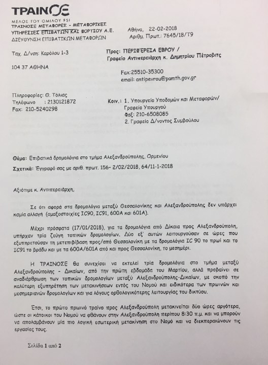 Παρακάτω σας παραθέτουμε τις επιστολές που απέστειλε η ΤΡΑΙΝΟΣΕ στον Αντιπεριφερειάρχη Έβρου: