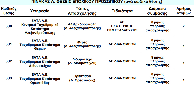 Aνακοίνωση για την πρόσληψη, με σύμβαση εργασίας ιδιωτικού δικαίου ορισμένου χρόνου, συνολικά πέντε (5) ατόμων δύο (2) ΔΕ ΕΣΩΤΕΡΙΚΗΣ ΕΚΜΕΤΑΛΛΕΥΣΗΣ και τριών (3) ΔΕ Διανομέων, πλήρους απασχόλησης χρονικής διάρκειας οκτώ (8) μηνών, για την κάλυψη εποχικών ή παροδικών αναγκών των Υπηρεσιακών Λειτουργιών των Ελληνικών Ταχυδρομείων (ΕΛΤΑ) Α.Ε.του Νομού 'Έβρου της Περιφερειακής Διεύθυνσης Δικτύου Λιανικής Μακεδονίας-Θράκης που εδρεύει στο Νομό Θεσσαλονίκης και συγκεκριμένα του εξής, ανά υπηρεσία, τόπο απασχόλησης, ειδικότητα και διάρκεια σύμβασης, αριθμού ατόμων, με τα αντίστοιχα απαιτούμενα (τυπικά και τυχόν πρόσθετα προσόντα.