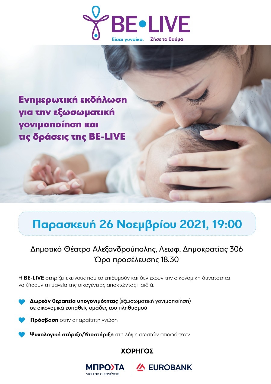 Το μη κερδοσκοπικό Σωματείο Be-Live ιδρύθηκε το 2019 και έχει ως κύριο σκοπό να βοηθήσει τα υπογόνιμα ζευγάρια που επιθυμούν να αποκτήσουν παιδί.