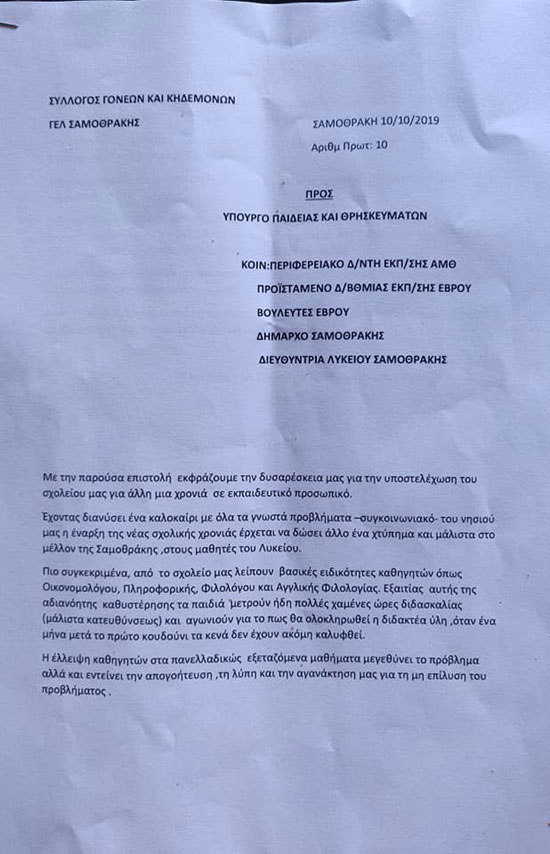 Ο Σύλλογος Γονέων & Κηδεμόνων του ΓΕΛ Σαμοθράκης με επιστολή του προς την Υπουργό Παιδείας ζητά την άμεση τοποθέτηση καθηγητών και σημειώνουν πως είναι αποφασισμένοι να υπερασπιστούν με κάθε τρόπο τα δικαιώματα των παιδιών τους.