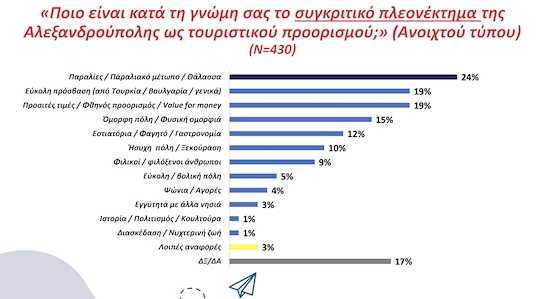 Πρόσφατη έρευνα, που κατέγραψε τις απόψεις των επισκεπτών σχετικά με το συγκριτικό πλεονέκτημα της πόλης ως τουριστικού προορισμού, ανέδειξε με σαφήνεια τι είναι αυτό που κάνει την Αλεξανδρούπολη ξεχωριστή. Τα αποτελέσματα φανερώνουν έναν προορισμό που στηρίζεται πρωτίστως στη φυσική του γοητεία.
