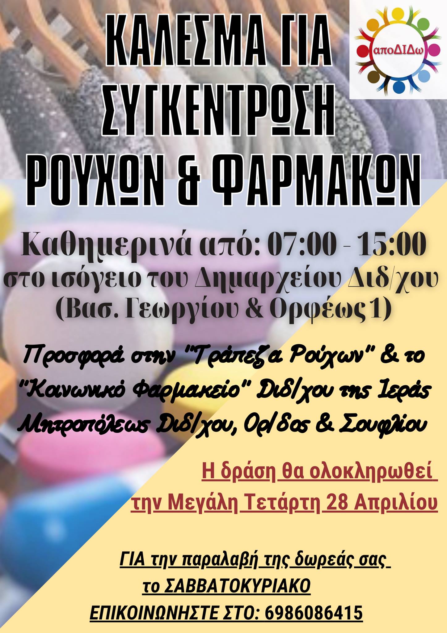 Από σήμερα λοιπόν, ημέρα Τετάρτη 21 Απριλίου και μέχρι την Μεγάλη Τετάρτη 28 Απριλίου, όποιος θέλεις μπορεί να βοηθήσει στη συγκέντρωση φαρμάκων και ρούχων για παιδιά και ενήλικες.
