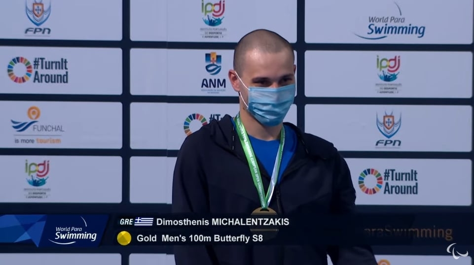 O Έλληνας και Εβρίτης Δημοσθένης Μιχαλεντζάκης τα "δίνει όλα" σε κάθε αγώνα μαζί με τον προπονητή του Τάσο Καλλιτσάρη. Ο «χρυσός» Παραολυμπιονίκης του Ρίο, όπως το 2018 στην Ιρλανδία, έτσι και αυτή τη φορά, στην Πορτογαλία, βρέθηκε στην κορυφή των 100μ. πεταλούδα S8, την ίδια στιγμή που η χώρα μας, κατά τη διάρκεια της 3ης ημέρας, πανηγύρισε ακόμη ένα μετάλλιο, χάλκινης απόχρωσης, με πρωταγωνιστή τον Αριστείδη Μακροδημήτρη στα 100μ. ύπτιο S2.