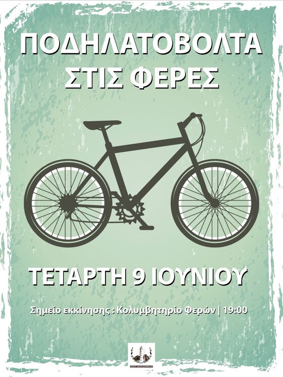 Με σημείο εκκίνησης τον χώρο του Κολυμβητηρίου Φερών, την Τετάρτη στις 19:00 παίρνουμε τα ποδήλατα, φοράμε τα κράνη μας και πάμε ποδηλατοβόλτα κάνοντας τον γύρο της πόλης των Φερών.