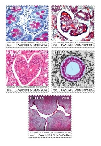 Πέντε τέτοιες απεικονίσεις μέσα από το μικροσκόπιο της Αναπληρώτριας Καθηγήτριας Ιστολογίας-Εμβρυολογίας στο Τμήμα Ιατρικής του Δημοκρίτειου Πανεπιστημίου Θράκης κυρίας Λαμπροπούλου Μαρίας, αποτυπώνονται στην Αναμνηστική Σειρά Γραμματοσήμων «Επιστήμη και Τέχνη μέσα από το μικροσκόπιο», φανερώνοντας ότι η μαγεία της τέχνης μπορεί να κρύβεται παντού.