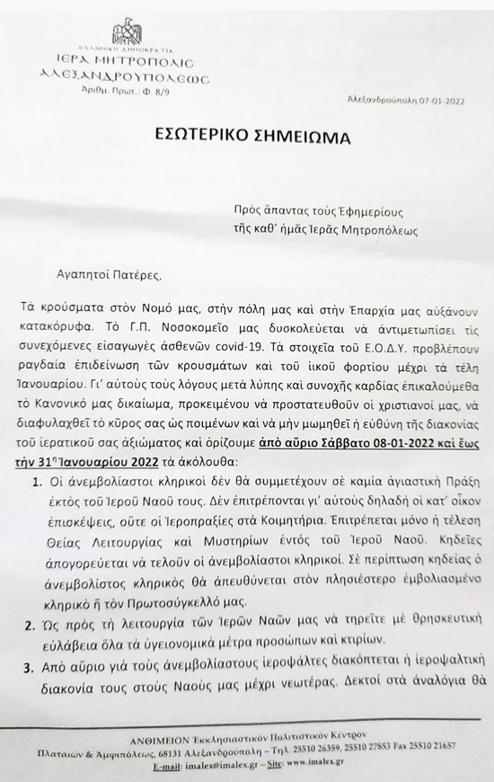 Ο Μητροπολίτης Αλεξανδρουπόλεως "απομακρύνει" τους ανεμβολίαστους ιερείς & ψάλτες