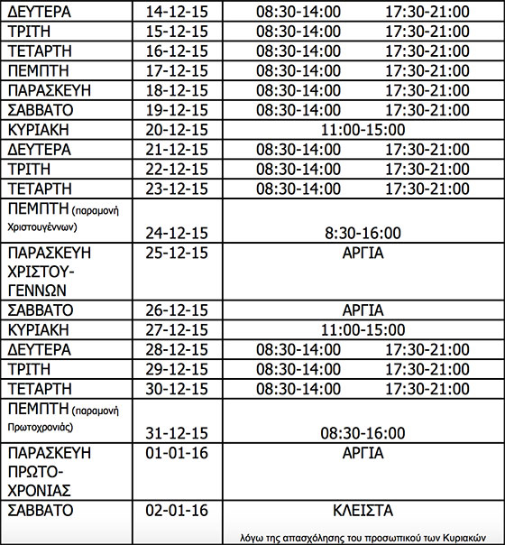 Κατά την εορταστική περίοδο, η οποία θα διαρκέσει από τις 14 Δεκεμβρίου έως τις 2 Ιανουαρίου, Τα καταστήματα θα ανοίγουν καθημερινές και το Σάββατο τόσο πρωί όσο και απόγευμα, ενώ θα είναι ανοιχτά και τη Κυριακή.
