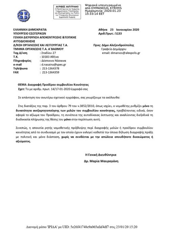 Με την υπ΄αριθ. 5133/23-1-2020 απάντηση στο σχετικό έγγραφο του Δημάρχου το Υπουργείο Εσωτερικών ξεκαθαρίζει ρητά ότι η διαγραφή μέλους παράταξης είναι πράξη με πολιτική και μόνο διάσταση, χωρίς να συνδέεται με την απώλεια οποιουδήποτε δικαιώματος ή αξιώματος.