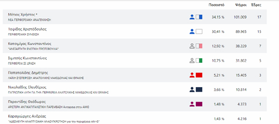 Στο 92,97% είναι η ενσωμάτωση των αποτελεσμάτων για την Περιφέρεια Ανατολικής Μακεδονίας και Θράκης, με τους Χρήστο Μέτιο και Χριστόδουλο Τοψίδη να είναι οι δύο "μονομάχοι" της β' Κυριακής.