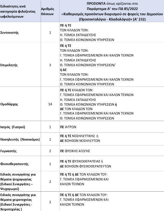 Όπως αυτά αναφέρονται στην υπ’αριθμ. ΚΥΑ 39272/12-4-2023 (ΦΕΚ 2488/Β’/18-4-2023) «Ανάθεση οργάνωσης και λειτουργίας Παιδικών Εξοχών - Κατασκηνώσεων του Κρατικού Προγράμματος σε Δήμους και στο νέο ΠΔ 85/2022 «Καθορισμός προσόντων διορισμού σε φορείς του Δημοσίου (Προσοντολόγιο - Κλαδολόγιο)» (Α’ 232).