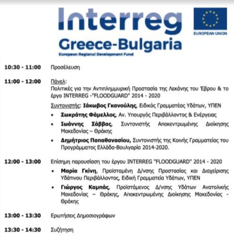 Την εκδήλωση την διοργανώνει η Ειδική Γραμματεία Υδάτων του Υπουργείου Περιβάλλοντος και Ενέργειας και θα πραγματοποιηθεί την Τετάρτη 19 Ιουνίου και ώρα 10.30 π.μ. στο κτήριο του Νομαρχείου Αλεξανδρούπολης (Βασ. Αλεξάνδρου & Ψαρών, 2ος όροφος).