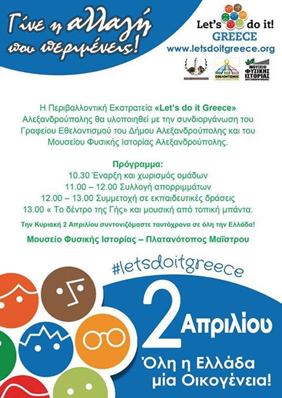 Ο Δήμος Αλεξανδρούπολης συμμετέχει στην Περιβαλλοντική Εκστρατεία «Let’s do it Greece» που θα υλοποιηθεί με τη συνδιοργάνωση του Γραφείου Εθελοντισμού του Δήμου Αλεξανδρούπολης και του Μουσείου Φυσικής Ιστορίας Αλεξανδρούπολης.