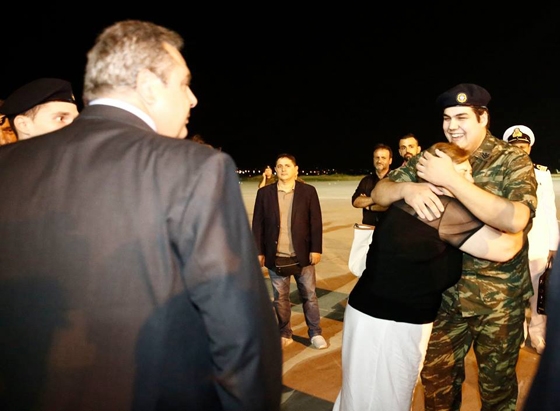 Στο αεροδρόμιο τους υποδέχτηκαν ο υπουργός Εθνικής Άμυνας Πάνος Καμμένος, ο υφυπουργός Εξωτερικών Γιάννης Αμανατίδης και ο αρχηγός ΓΕΣ Αλκιβιάδης Στεφανής, καθώς και οι γονείς τους.
