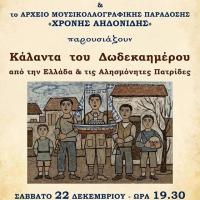 Το Σύνολο Παραδοσιακής Μουσικής της Μητρόπολης Αλεξανδρούπολης και το Αρχείο Μουσικολαογραφικής Παράδοσης «ΧΡΟΝΗΣ ΑΗΔΟΝΙΔΗΣ» διοργανώνουν Χριστουγεννιάτικη Συναυλία με κάλαντα του Δωδεκαημέρου από όλη την Ελλάδα και τις Αλησμόνητες Πατρίδες. Η εκδήλωση θα πραγματοποιηθεί το Σάββατο 22 Δεκεμβρίου 2018 στις 19...