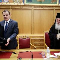 Τον Αρχιεπίσκοπο Αθηνών και πάσης Ελλάδας κ.κ. Ιερώνυμο Β' επισκέφθηκε σήμερα ο υπουργός Εθνικής Άμυνας Νικόλαος Παναγιωτόπουλος στα γραφεία της Διαρκούς Ιεράς Συνόδου προκειμένου να παραλάβει ειδικό εξοπλισμό για τις δυνάμεις που φυλάσσουν τα σύνορα στον Έβρο και τη...