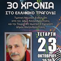 Ο μεγάλος στιχουργός Λευτέρης Χαψιάδης που κλείνει φέτος 30 χρόνια επιτυχίας στο ελληνικό τραγούδι, θα τιμηθεί σε εκδήλωση που θα πραγματοποιηθεί στην Αλεξανδρούπολη. Την τιμητική βραδιά, η οποία θα πραγματοποιηθεί την Τετάρτη 23 Οκτωβρίου 2013 στις 20:30 στο Δημοτικό Θέατρο...