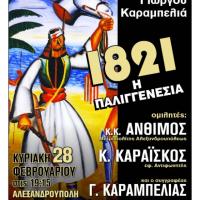 H Ιερά Μητρόπολις Αλεξανδρουπόλεως και η Κίνηση Αλληλεγγύης Πολιτών Αλεξανδρούπολης (Κ.Α.Π.Α.) σας προσκαλούν στην εκδήλωση - βιβλιοπαρουσίαση του βιβλίου «1821 - Η Παλιγγενεσία» του Γιώργου Καραμπελιά, η οποία θα πραγματοποιηθεί την Κυριακή 28 Φεβρουαρίου και ώρα 19:15 στο πνευματικό κέντρο...