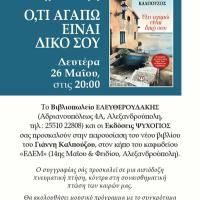 Το βιβλιοπωλείο 'Ελευθερουδάκης' της Φωτεινής Σκαρλακίδου και οι εκδόσεις 'Ψυχογιός' σας προσκαλούν τη Δευτέρα 26 Μαΐου 2014 στις 20:00 μ.μ. στον κήπο του Καφωδείου, 'Εδέμ' στην παρουσίαση του νέου βιβλίου του Γιάννη Καλπούζου 'Ότι αγαπώ είναι δικό σου'.Ο...