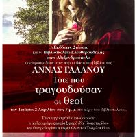 Το Βιβλιοπωλείο "Ελευθερουδάκης" - Φωτεινή Σκαρλακίδου και οι Εκδόσεις 'Διόπτρα' σας προσκαλούν την Τετάρτη 2 Απριλίου στις 19:00μ.μ στην παρουσίαση του βιβλίου, της συγγραφέως Άννας Γαλανού, με τίτλο 'Τότε που τραγουδούσαν οι θεοί' στην αίθουσα παρουσιάσεων του βιβλιοπωλείου (Αδριανουπόλεως...