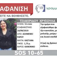 Έρευνες για τον εντοπισμό 51χρονης, διεξάγονται τα τελευταία 24ωρα στην ευρύτερη περιοχή του Έβρου. Η Τσιακιρίδου Χρυσούλα εξαφανίστηκε και αναζητείται, και σύμφωνα με την ανακοίνωση της Γραμμής Ζωής η ζωή της βρίσκεται σε κίνδυνο. Η 51χρονη από το Ασημένιο Έβρου...