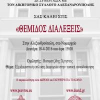 Ξεκινά τη Δευτέρα, 21 Μαρτίου 2016, ο νέος κύκλος διαλέξεων της ΑΚΑΔΗΜΙΑΣ Π.Ε. ΕΒΡΟΥ υπό τον τίτλο «ΘΕΜΙΔΟΣ ΔΙΑΛΕΞΕΙΣ» που πραγματοποιεί η Περιφέρεια Ανατολικής Μακεδονίας Θράκης – Περιφερειακή Ενότητα Έβρου σε συνεργασία με τους Δικηγορικούς Συλλόγους Αλεξανδρούπολης και Ορεστιάδας...