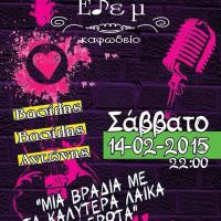 Το Σάββατο 14 Φεβρουαρίου το Καφωδείο Εδέμ έχει ετοιμάσει για εσάς μια όμορφη βραδιά με πολύ ερωτική λαϊκή μουσική! Τρεία νέα παιδιά θα σας ταξιδέψουν μουσικά με τα πιο αγαπημένα ερωτικά τραγούδια ελλήνων συνθετών και ερμηνευτών. Το ραντεβού μας είναι...