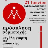 Η 18η Ευρωπαϊκή Γιορτή της Μουσικής πλησιάζει! Φέτος ο Ν. Έβρου συμμετέχει με Ορεστιάδα, Διδυμότειχο, Σουφλί και Αλεξανδρούπολη στις 20 – 23 Ιουνίου 2017 με σκοπό να παρουσιάσει δωρεάν μουσικές συναυλίες σε δρόμους και πλατείες. Η τοπική διοργάνωση www.evros-emd...